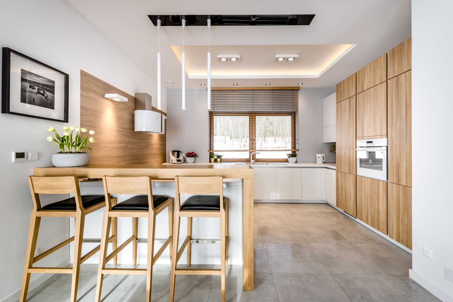 Wyspa kuchenna może być zintegrowana z barkiem, efektownie łączyć się ze stołem, a czasami równocześnie dzieli zadania miejsca do pracy i siedzenia.